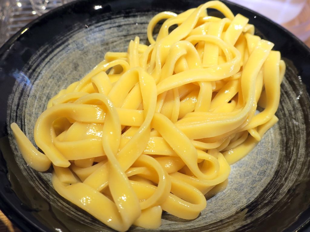 麺は自家製麺。平打ちを指定した麺は極太で、やや細目のきしめんのチック。