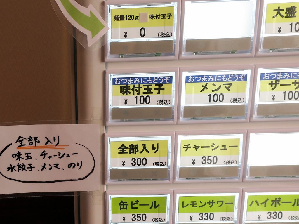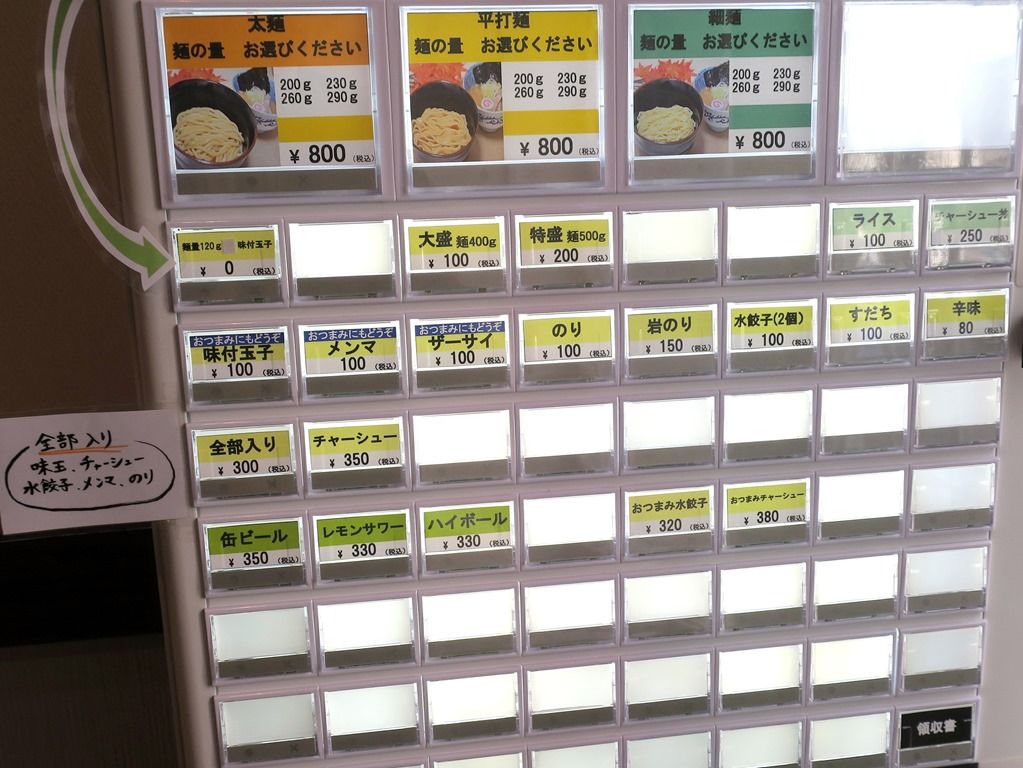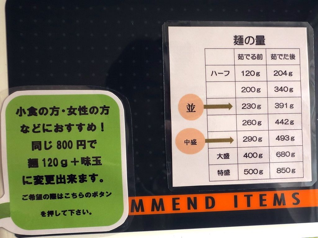 麺量が200g・230g・260g・290gから選択。どれでも均一800円。大盛400g100円、特盛500g200円。
