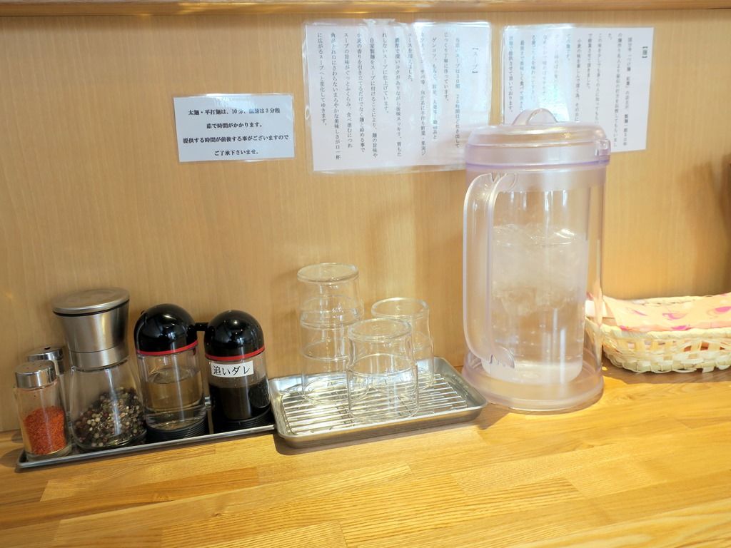 BGMはJ-Pop。箸は洗い箸でエコ仕様。卓上調味料は、一味唐辛子、ミックスペッパー、酢、追いダレ。