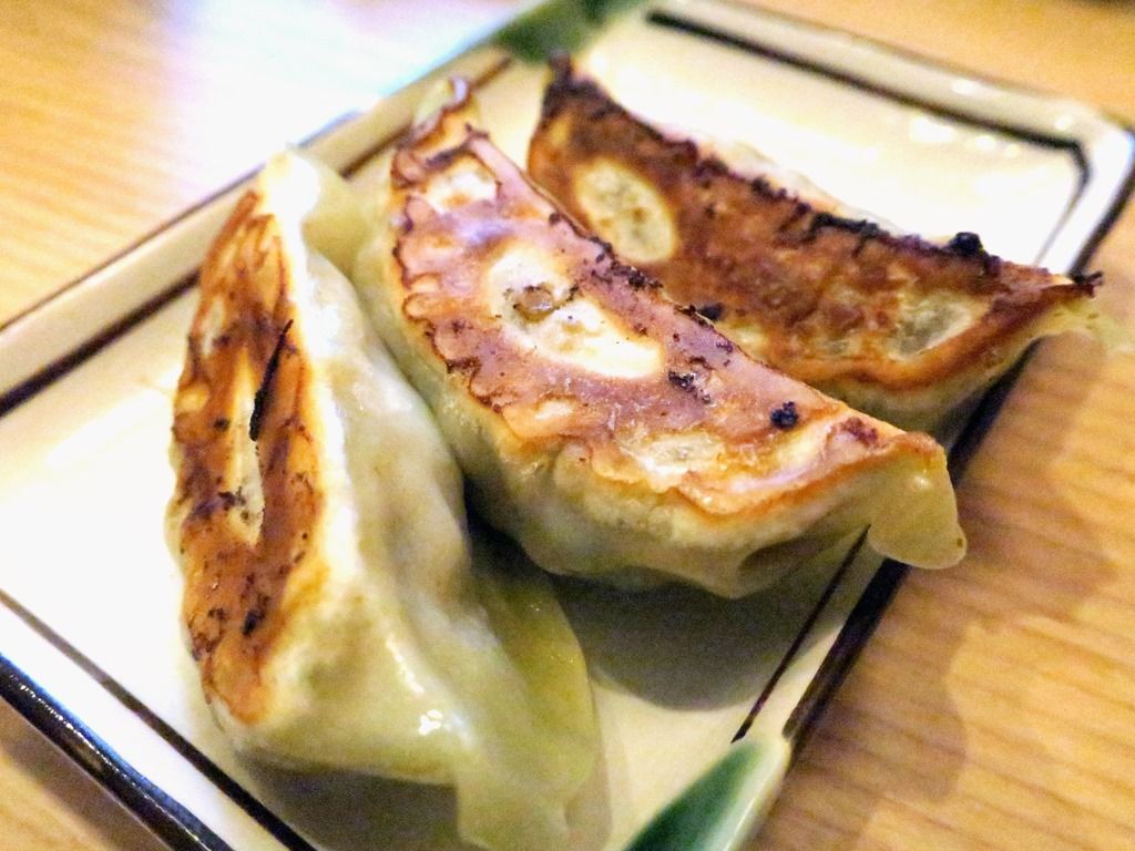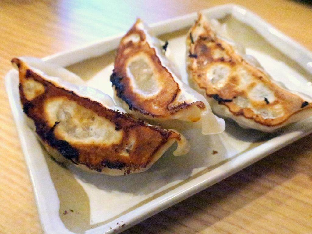 餃子セットの餃子。餃子を注文すると、ニンニク有りかニンニク無しを聞かれます。こちらはにんにく有り。餃子ダレもありますが、どろだれラー油と酢でいただくのがヤバウマ!