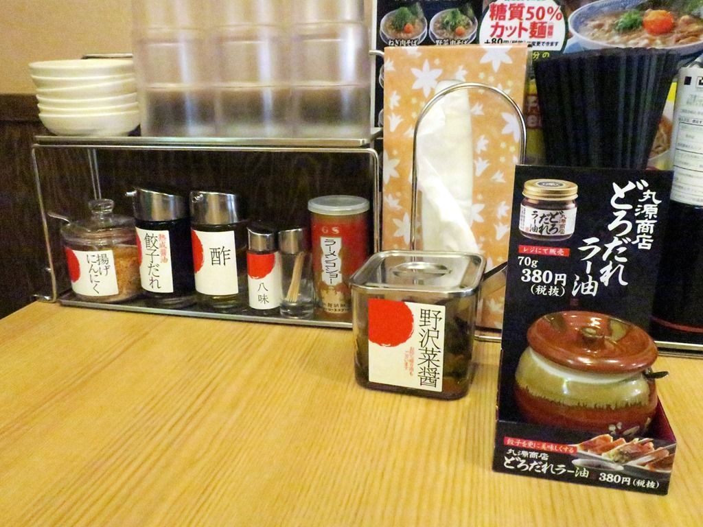 箸は洗い箸でエコ仕様。卓上調味料・薬味は、揚げにんにく、餃子だれ、酢、八味、GSラーメンコショー、野沢菜醤、どろだれラー油。
