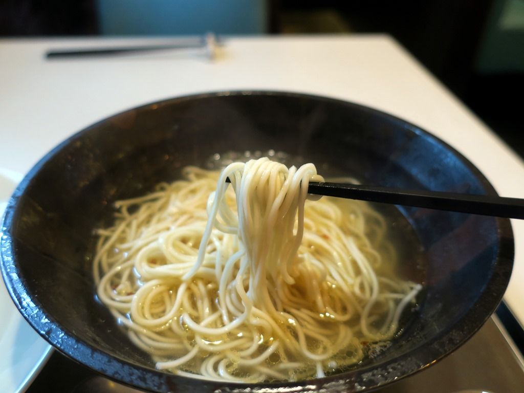 スープはさらさらの清湯塩味。あっさりとしてクリアーで澄んだチキンコンソメ。レンゲの代わりにスプーンが供されます。アミノ酸調味料不使用。かすかに生姜の様なミントみたいな清涼感があります。すっと沁み入るような滋味と心地よい余韻が広がります。最高に美味しい!