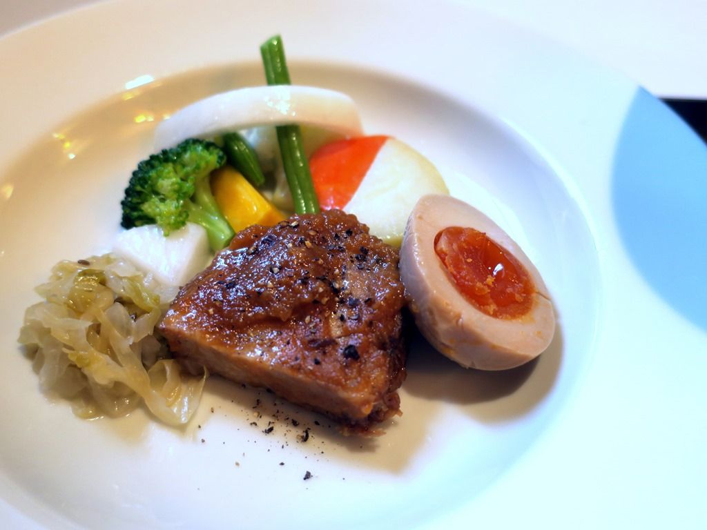 ガルニチュールのメインは、豚肉のカルボナード(ベルギー料理・ビール煮)、味玉はタレに数日間漬け込んだもの。キャベツの酢漬け。ブロッコリー、にんじん、かぶなどの野菜のマリネには、クミンシードでほのかなカレー風味に。メインの肉は不定期に変わるとのこと。