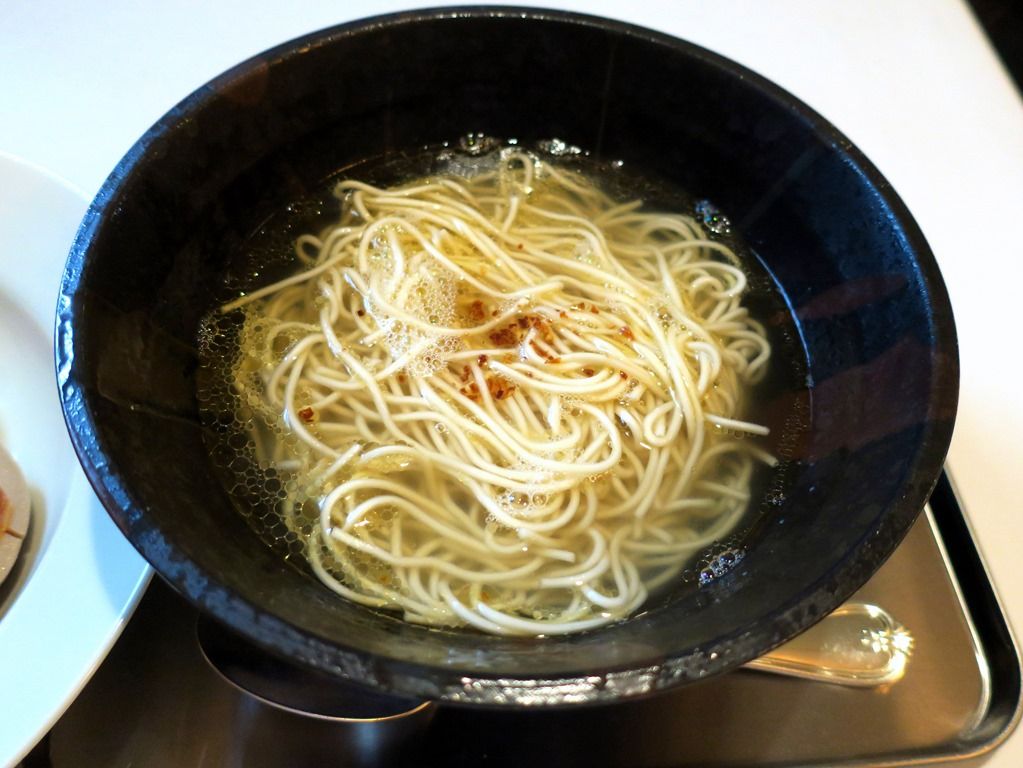 当然ですが券売機は無く後会計制。メニューは、塩ラーメン900円、アッラ・ガルム醤油ラーメン900円、日替りラーメン1200円、ライス100円。アッラ・ガルムとはイタリアの魚醤。この日の日替りは岩手気仙町産牡蠣のチャウダー。もちろんシェフの解説付き。オーダーは、基本の塩ラーメンで。