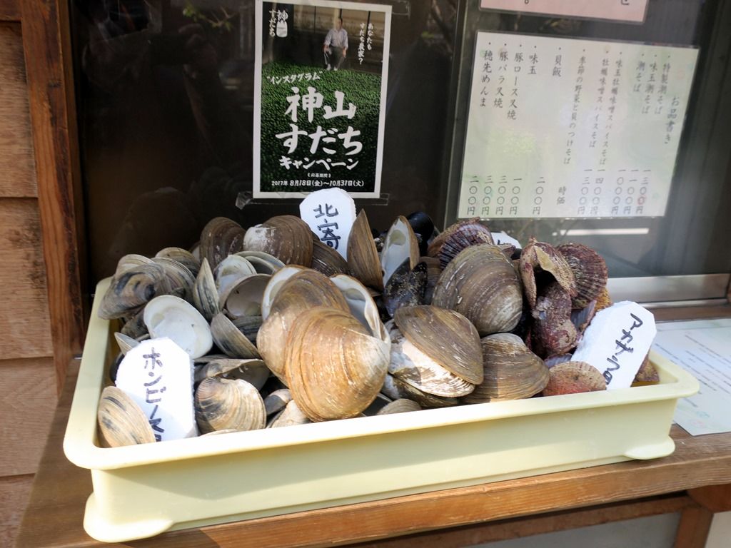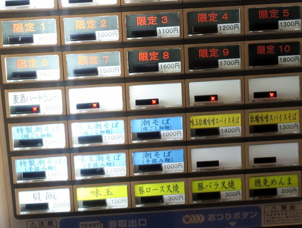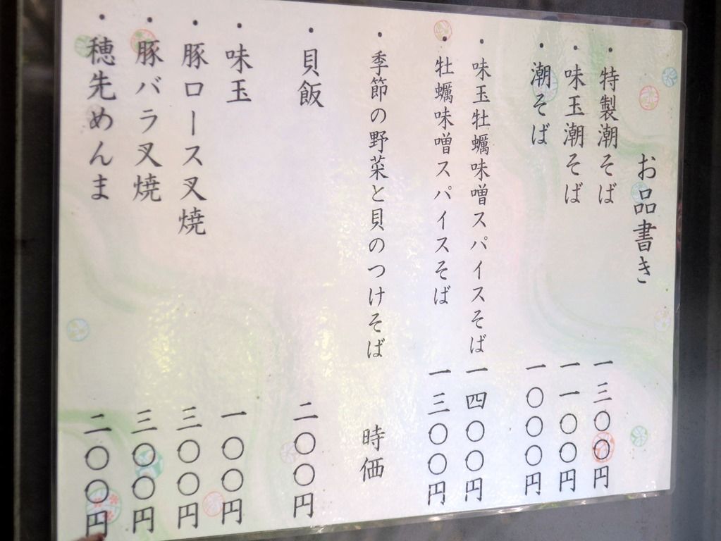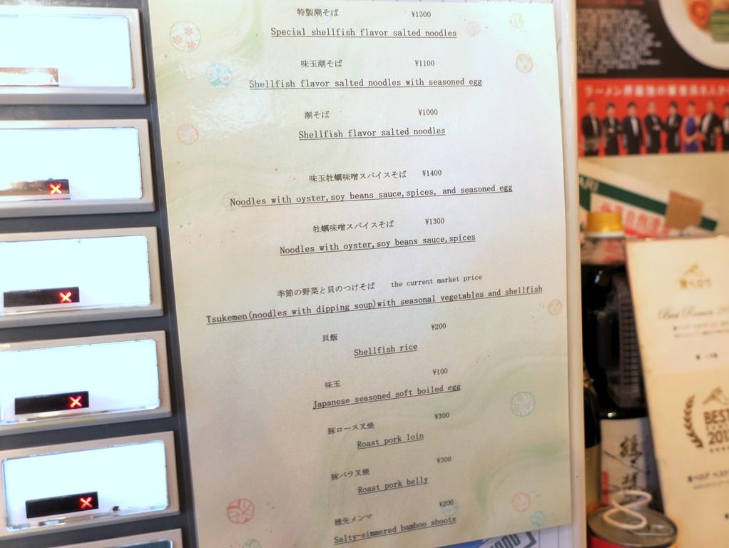 主なメニューは潮そば1000円、牡蠣味噌スパイスそば1300円、季節の野菜と貝のつけそば 時価、貝飯200円、他。麺を「絹ごし細麺」・「手揉み麺」から券売機のボタンで選びます。