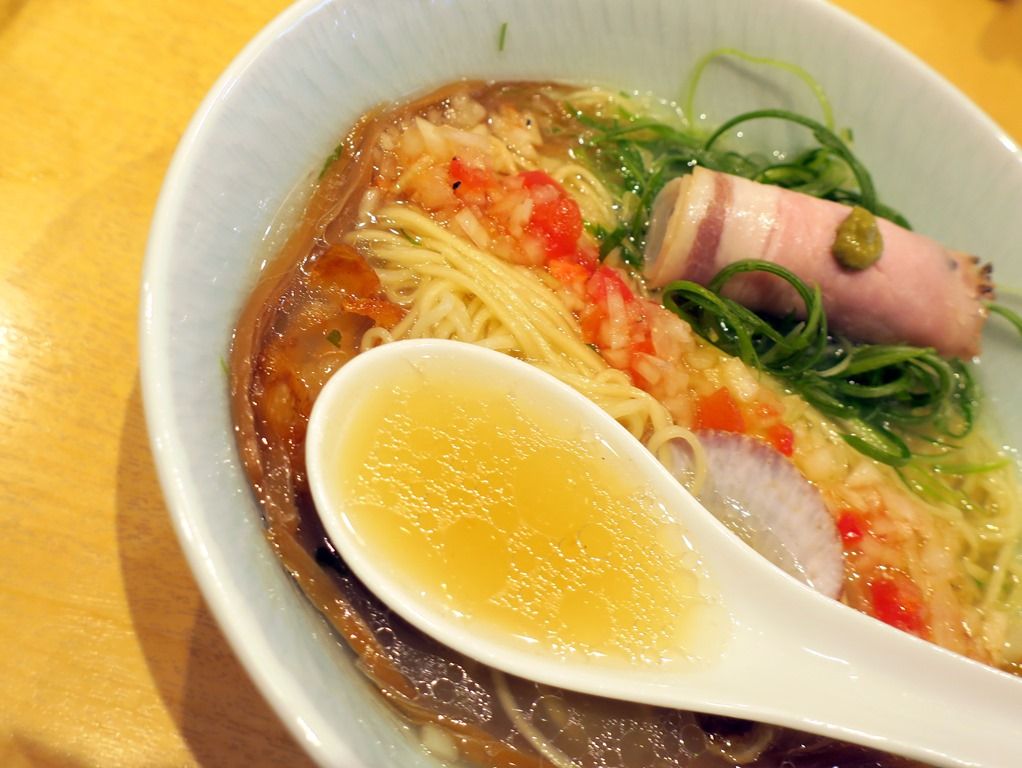 改めて具は、穂先メンマ、赤ざら貝(宮城県石巻市萩浜産)、浅利と玉葱の真薯揚げ。丼を斜めに横切る盛り付けはトマトサルサソース、このために麺をV字に整麺するこだわりよう。奥に九条ねぎ。上には豚ロース叉焼を2枚巻いたもの。上にグリーンタプナード(フレンチの技法でオリーブオイル にんにくを使ったプロヴァンス地方のペースト)。
