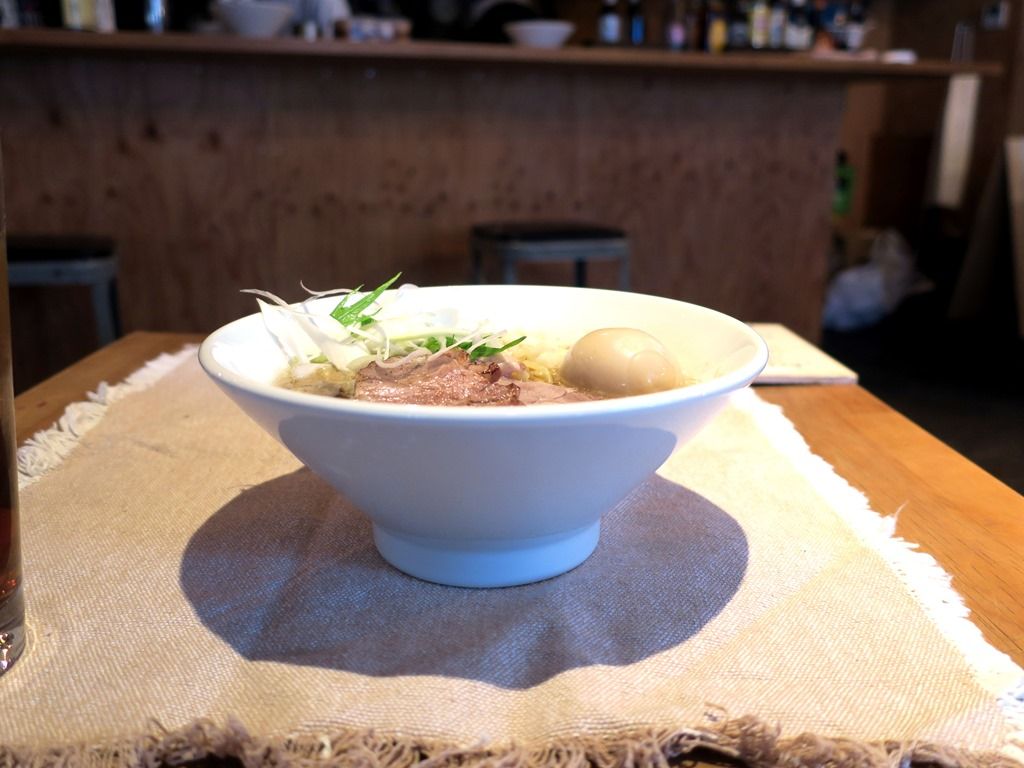 店内は、2人卓x5、奥に二人がけソファー。11:40頃到着で、先客1、後客1。バーカウンターの中には店主さん、ホール担当の女の子の2名体制。店主さんはバイト程度で修行経験はなく、ラーメンは独学だそうです。