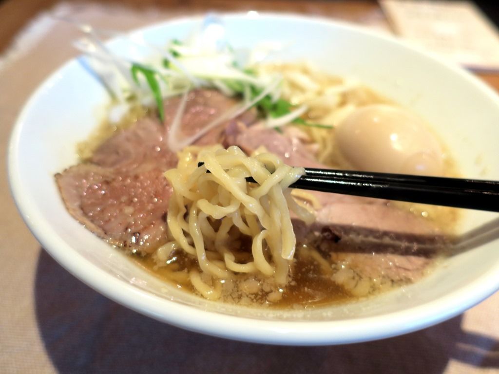 スープはさらさらの清湯醤油味。ライトな煮干出汁ですが、煮干の輪郭はくっきり。背脂の上品な甘味とコクが、スープに厚みを与えています。もともとやや温いのと、味玉が冷たくてスープが冷めるのが早いのがちょっと惜しい点。温度以外はいい味わい、。美味しい!