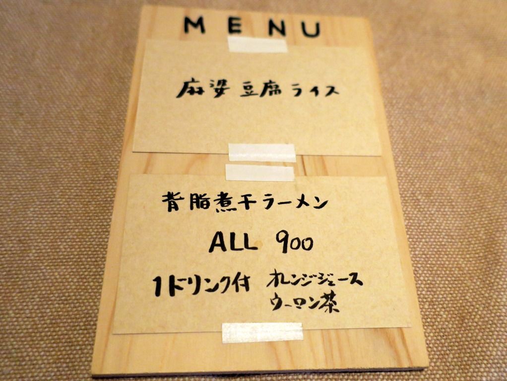券売機はなく後会計制。この日のメニューは、麻婆豆腐ライス、背脂煮干ラーメン(ドリンク付)各900円。ドリンクは烏龍茶orオレンジジュース。