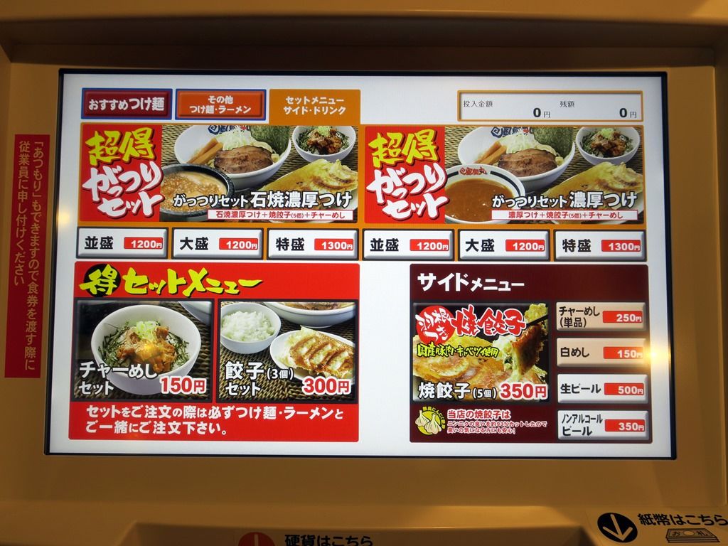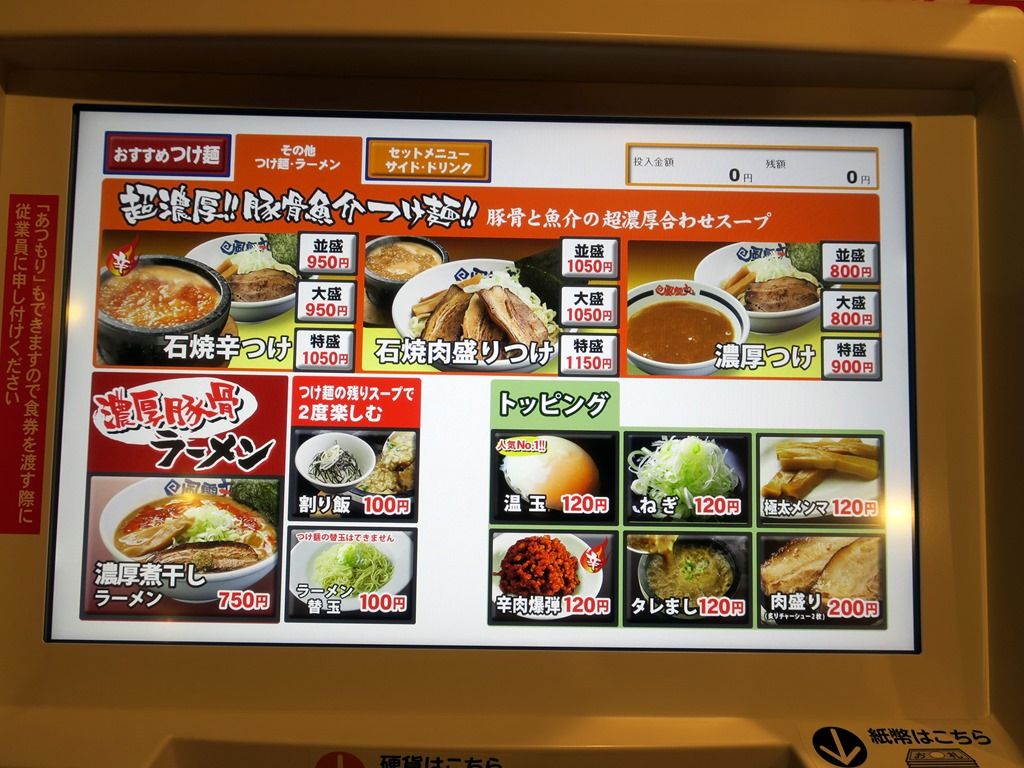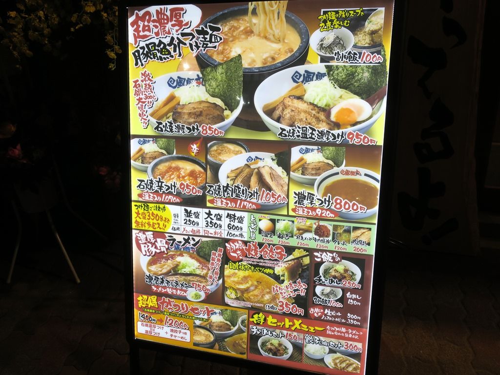 主なメニューは、石焼濃厚つけ麺850円、石焼辛つけ麺950円、濃厚つけ麺800円、濃厚煮干ラーメン750円、他。