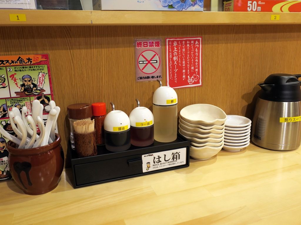 卓上調味料は、一味唐辛子、胡椒、醤油、ラー油、酢。