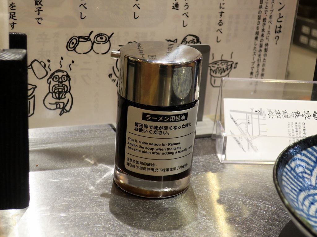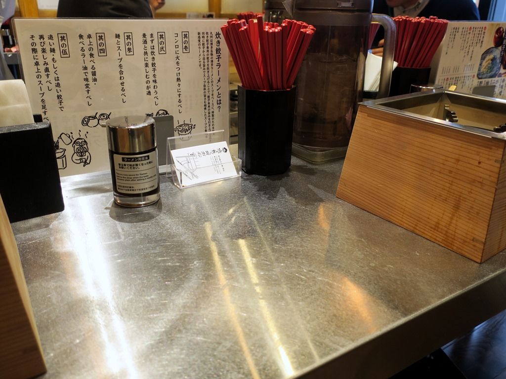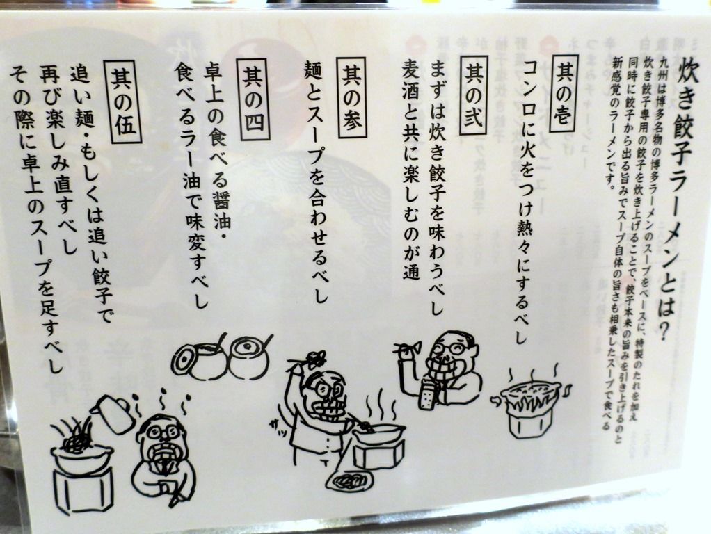 食券を渡すと、食べ方の説明があります。「グツグツ言い出したら火を止めて下さい。最初に餃子を食べてから麺を入れて下さい。食べるラー油と食べる醤油で味を変えると最後まで美味しくいただけます。」とか。