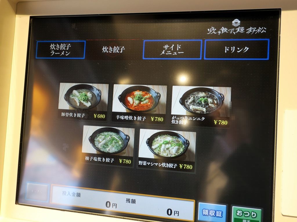 主なメニューは、豚骨炊き餃子ラーメン780円、辛味噌炊き餃子ラーメン880円、柚子塩炊き餃子ラーメン880円、他。