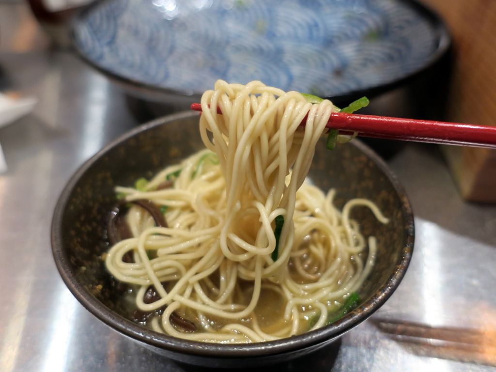 麺はストレート細麺。スープは豚臭さの無いマイルドな豚骨醤油。炊き餃子鍋のシメに麺を入れた感。ソツなく美味しい!