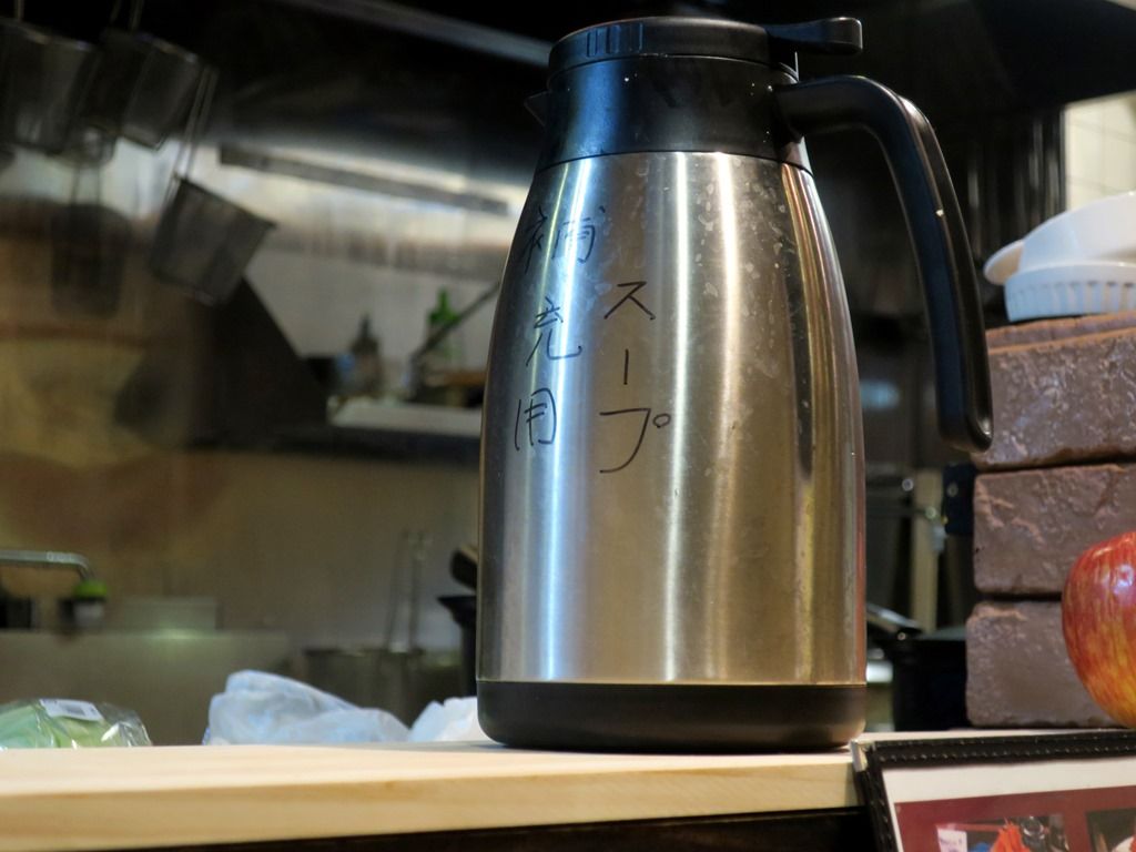 カウンター上のボットは、補充用スープ!?つけ麺用割りスープでしょうか。