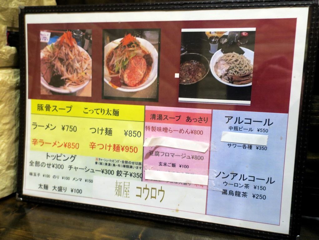 券売機はなく先会計制。主なメニューは、ラーメン750円、つけ麺850円、特製味噌らーめん800円、豆腐フロマージュ800円、大盛100g50円・200g100円、他。女性はトッピング1個サービス。