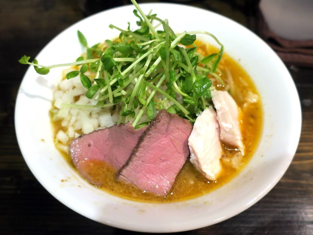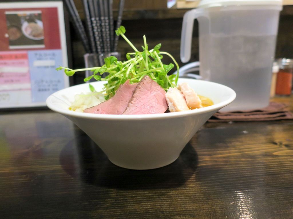 具は、ローストビーフ、鷄チャーシュー、豆苗、ゆでもやし、きざみ玉ねぎ。ローストビーフは強い味噌の風味に負けないようにとオーク材のチップで燻製したもの。