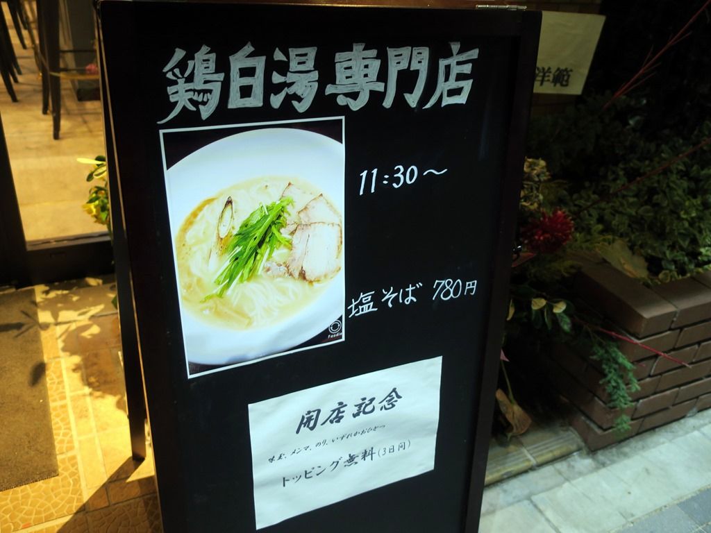 券売機の前に立つと、本日まで塩そばのみの提供。オープン記念として、味玉、メンマ、海苔、いずれか一品サービスのアナウンスがあります。