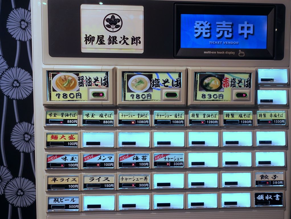 入店すると、まず券売機で食券購入です。主なメニューは、醤油そば780円、塩そば780円、赤塩そば830円、他。