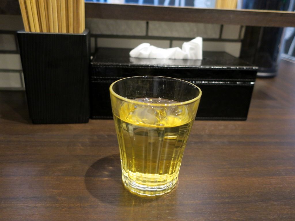 箸は割り箸。卓上調味料はおろしニンニク、胡椒、一味唐辛子。お冷がわりの冷茶はジャスミン茶。