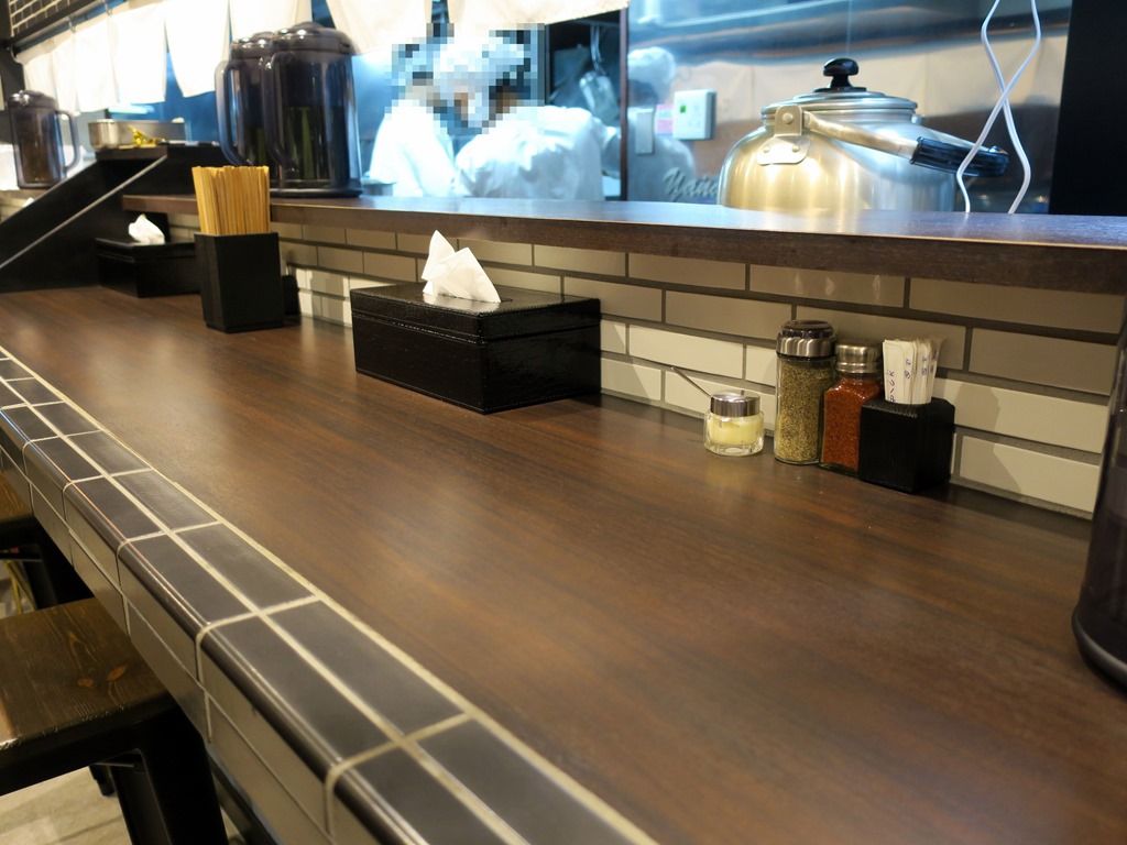 店内は、厨房を囲むL字型カウンター7席(1席・間があって4席・短辺2席)、壁に向かったカウンター7席、4人卓x1。内装は、ニューヨークスタイルと和を融合させたデザインとか。