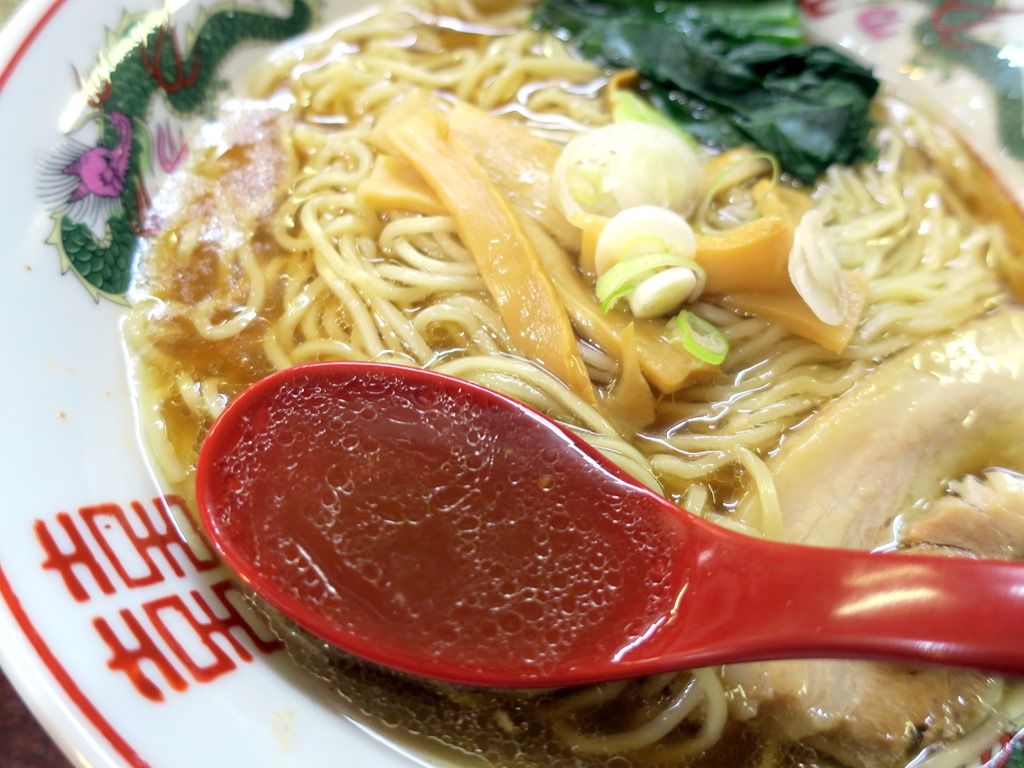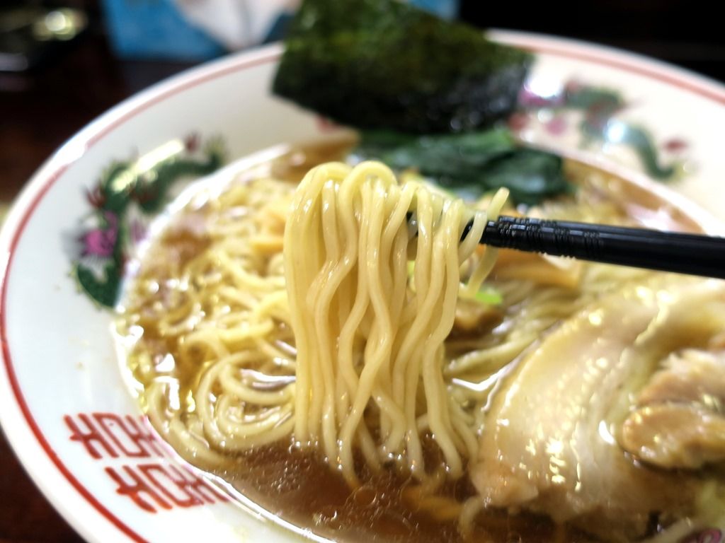 麺は中細縮れタイプ。花輪から川上製麺所製でしょうか。レトロな雰囲気の一杯を演出するに相応しい麺でするするっとイケちゃいます。