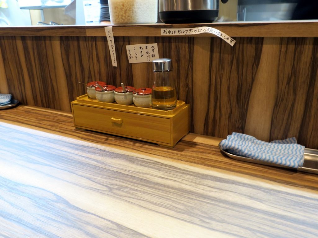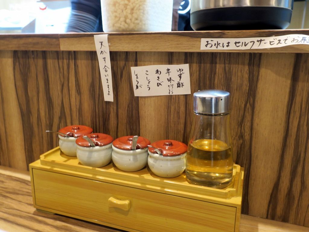 BGMはポップス。箸は割り箸。卓上調味料・薬味が充実していて、ゆず酢、自家製辛味、わさび、こしょう、しょうが。カウンター上に天かす。