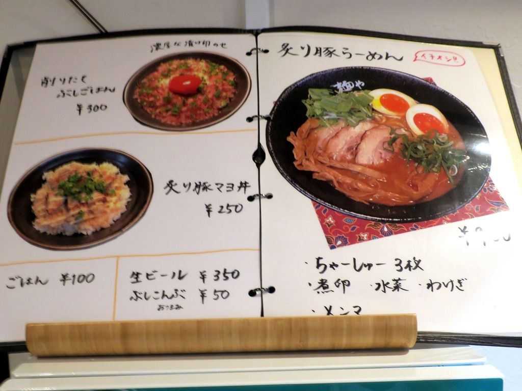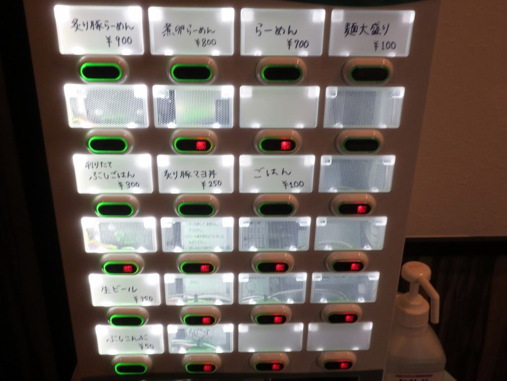 入店すると、まず券売機で食券購入です。主なメニューは、炙り豚らーめん900円、らーめん700円、削りたてぶしごはん300円、炙り豚マヨ丼250円、他。