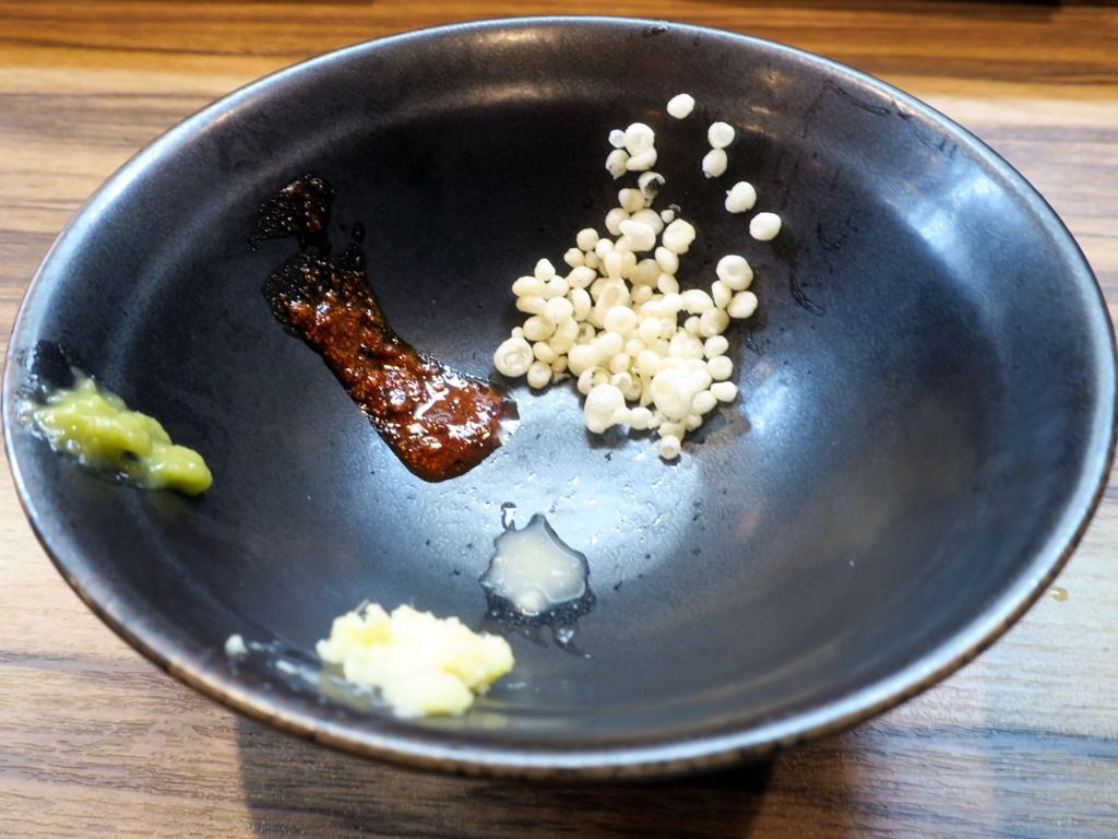 胡椒以外一通り試した味変アイテムでは、辛味、しょうが、天かすは期待通りの効果を発揮。特に良かったのがゆず酢とわさびで、ゆず酢は酸っぱくなくてスッキリリフレッシュ。わさびがこれほど豚骨に合うとは新発見で、勉強になりましたw