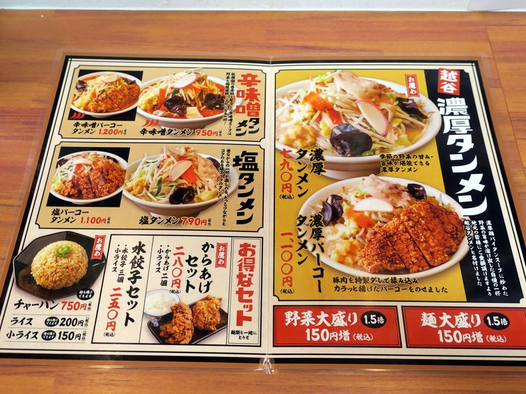 主なメニューは、濃厚タンメン790円、濃厚パーコータンメン1100円、辛味噌タンメン950円、塩タンメン790円、他。