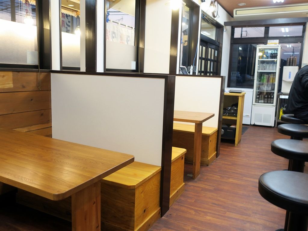 店内は厨房前に真っ直ぐなカウンター8席、4人卓x3。