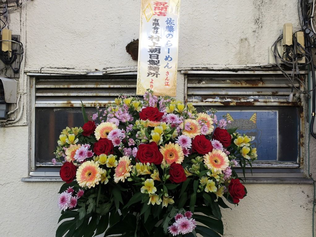 店頭の開店祝い花は、村上朝日製麺から。