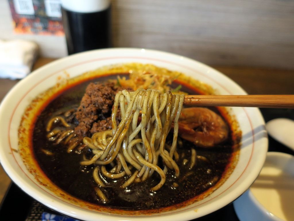 真っ黒なスープはさらりとした辛シビ味。ポスターによると、「スープには、海老、鶏ガラ、ゲンコツ、豚足、モミジ、鶏皮で出汁を取り、そこに昆布、サバ節。カタクチイワシ、ソウダ節の出汁、イカスミをブレンド」とのこと。真っ黒な正体はイカスミ。