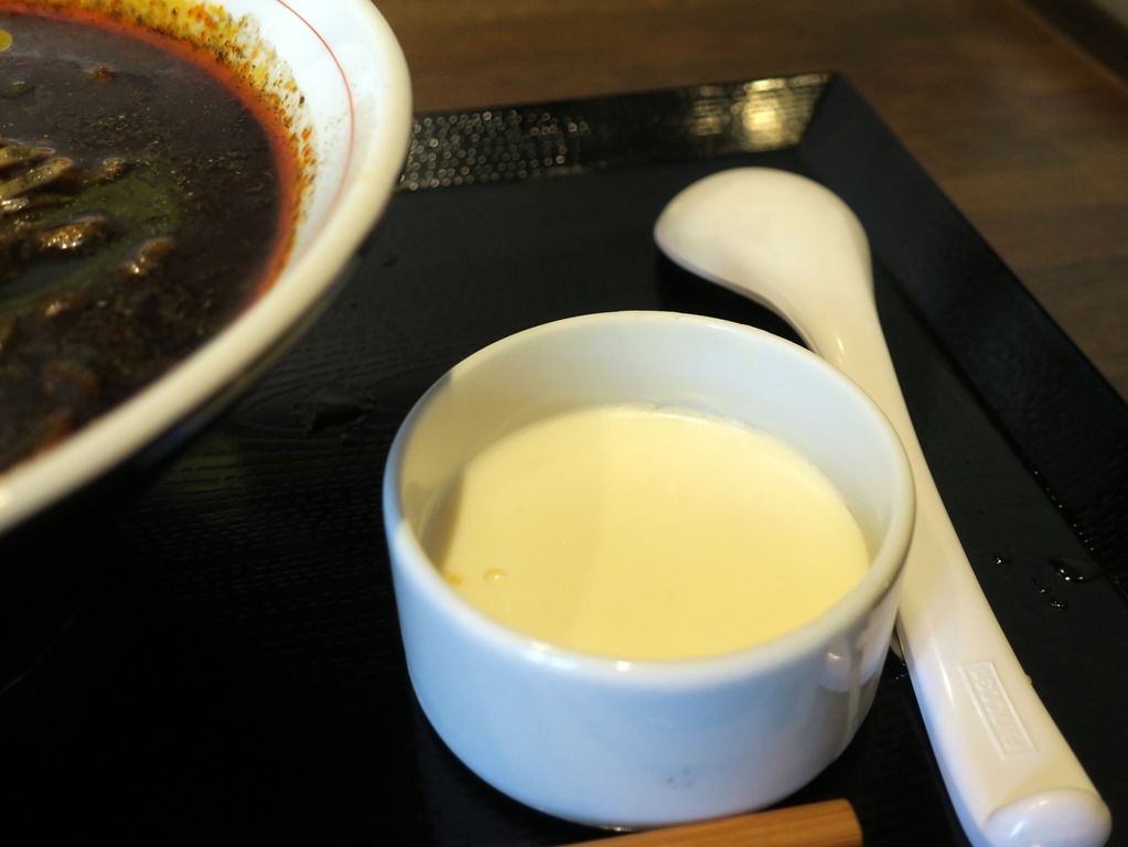 食後のデザートに自家製クリーム杏仁豆腐。冷し麺に温かいお茶が付くのは何軒かありましたが、ラーメン専門店で激辛麺にデフォで甘いデザートが付くのは珍しい。さすが中華30年の経験!ショッパイものの後に甘いものが食べたくなり、杏仁豆腐でリフレッシュ。するとまたショッパイものが欲しくなってスープを飲んじゃう好循環w シビ辛甘の振れの大きさで、旨さがいっそう引き立ちます。