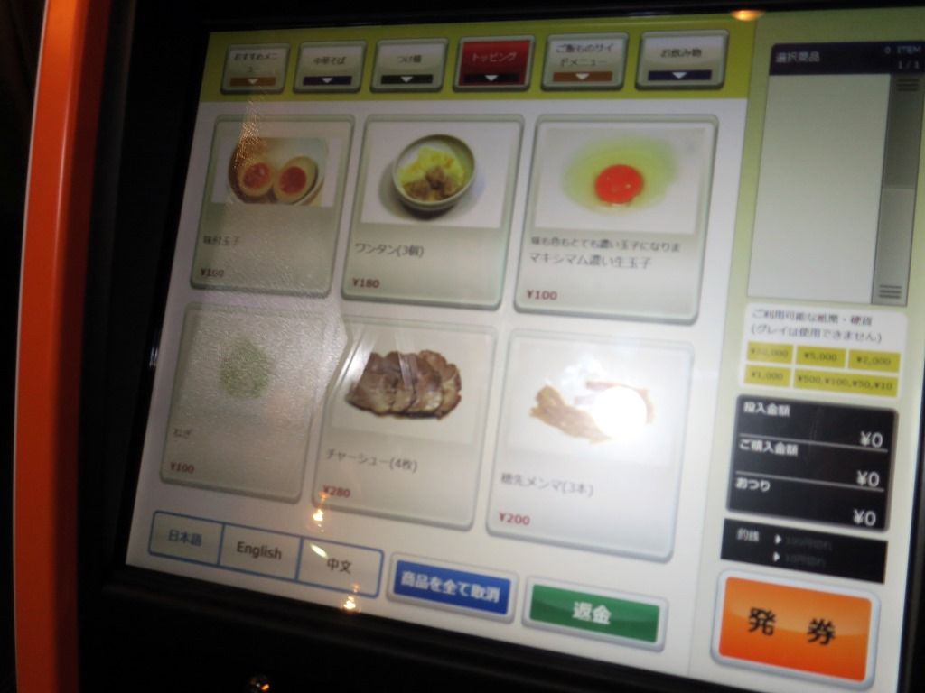 タブは、おすすめメニュー・中華そば・つけ麺・トッピング・ご飯ものサイドメニュー・飲み物と細かく別れていて、ちょっと操作が面倒。