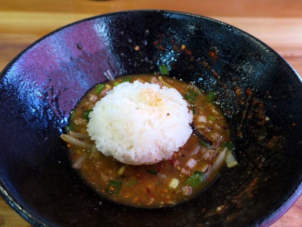麺を食べ終えたら仕上げに追い飯。まぜそば・和え麺の〆ライスは、炭水化物に追い炭水化物で満足度も糖質もうなぎ登りですが、止められませんw