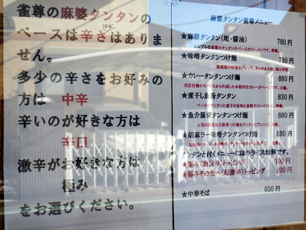 主なメニューは、麻婆タンタン塩・醤油780円、煮干魚粉タンタン830円、味噌タンタンつけ麺830円、カレータンタンつけ麺880円、魚介豚骨タンタンつけ麺880円、塩そば・中華そば600円、雀尊カレー880円、激辛トッピング極み100円、極みその先へ200円、他。