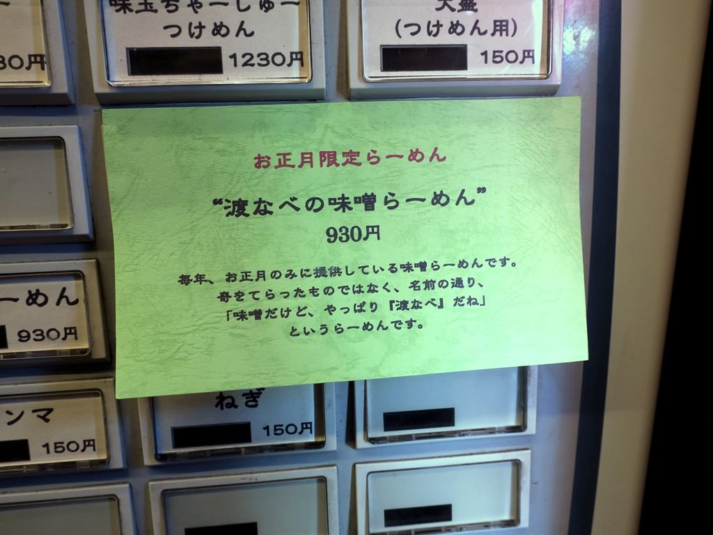お目当ては、お正月限定らーめん「渡なべの味噌らーめん」930円。毎年正月に提供しているそうですが今回初。と思ったら、2008年に食べてました(^_^;)1週間位の予定とか。元旦の華やかな限定と2日からの期間限定の2本立て。なお、2日以降はレギュラーメニューもオンストア。