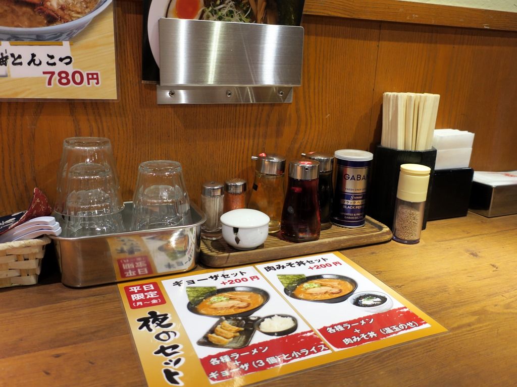 BGMはジャズ。箸は割り箸。卓上調味料は、おろしニンニク、一味唐辛子、酢、ラー油、醤油、GABANブラックペッパー。