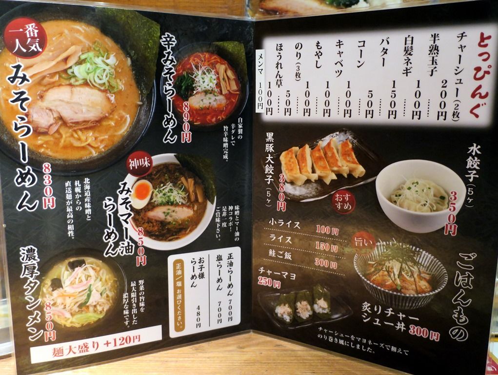 主なメニューは、みそらーめん830円、辛みそらーめん890円、濃厚タンメン950円、正油らーめん700円、塩らーめん、他。