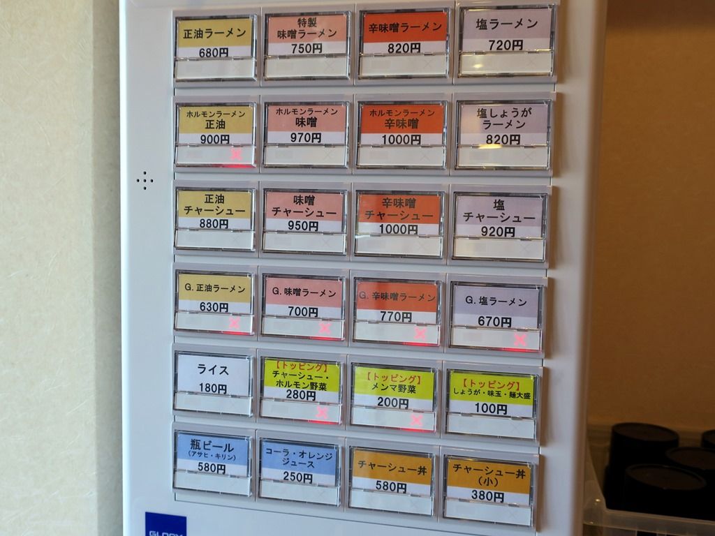 入店するとまず券売機で食券購入です。主なメニューは、正油ラーメン680円、特製味噌ラーメン750円、辛味噌ラーメン820円、塩ラーメン720円、ホルモン正油ラーメン900円、ホルモン味噌ラーメン970円、ホルモン辛味噌ラーメン1,000円、塩しょうがラーメン820円、他。