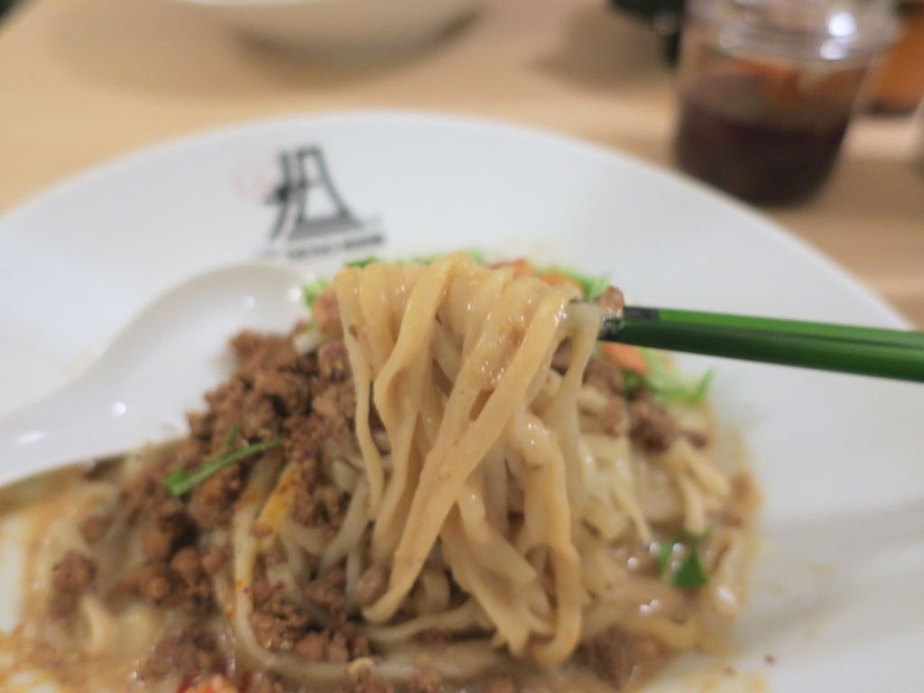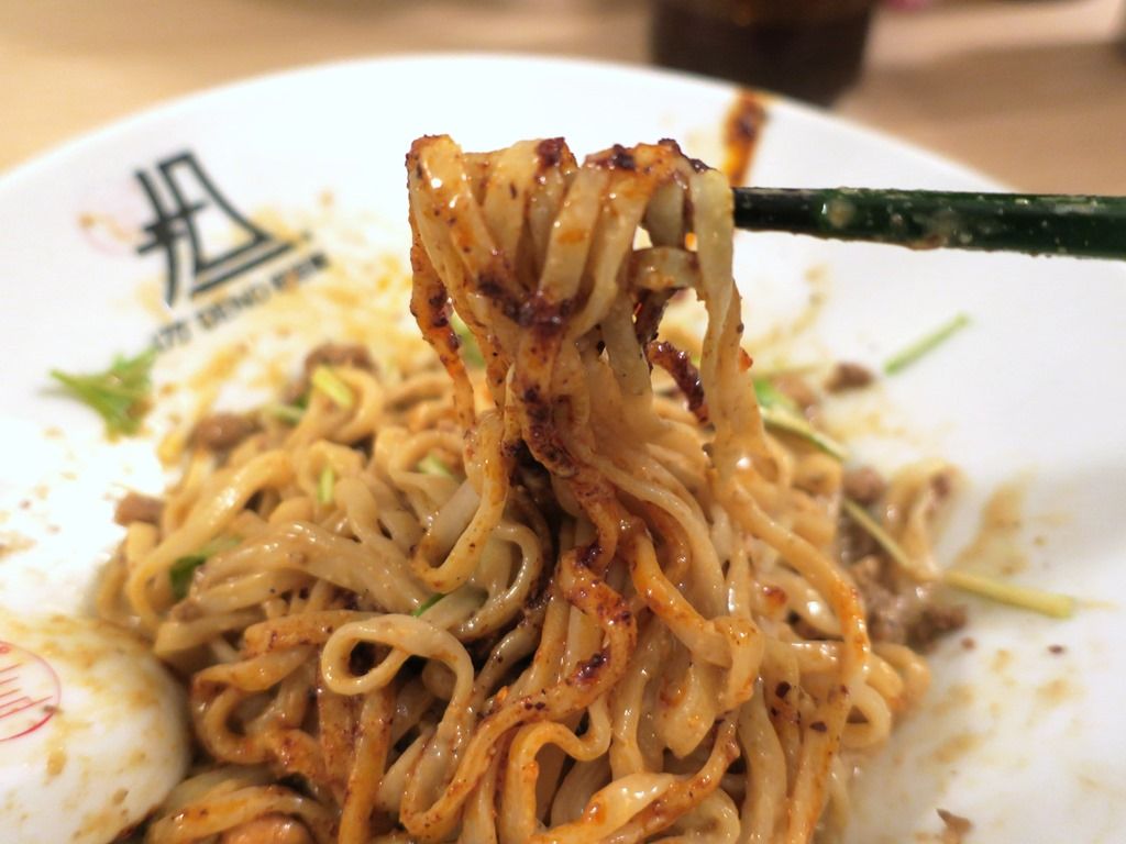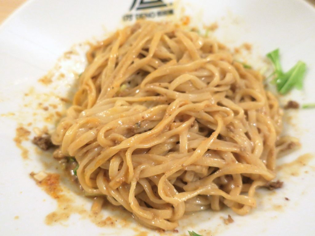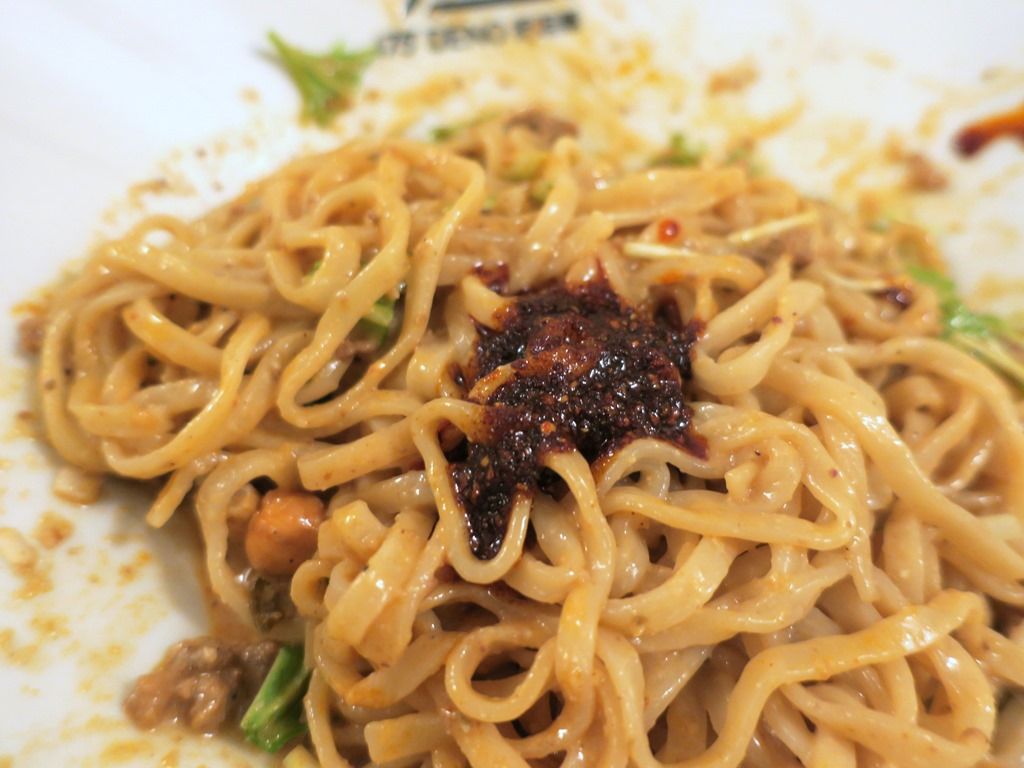 具は、肉味噌、海老、ナッツ。ソースの様な芝麻醤ベースの濃厚なタレがたっぷりで、あらかじめ麺に絡んだ様な状態で提供されます。