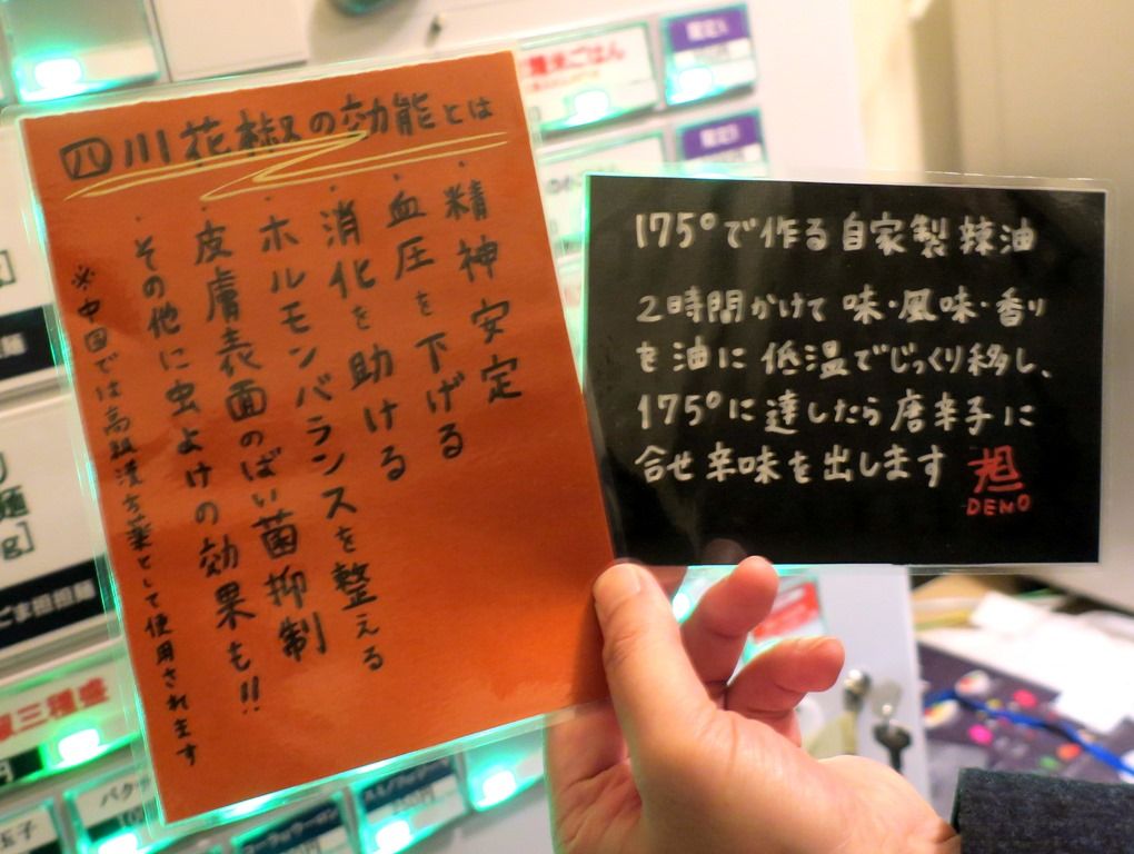 店名の由来は、自家製辣油を作るときの油の温度175℃+店主さんの苗字(出野さん)から。