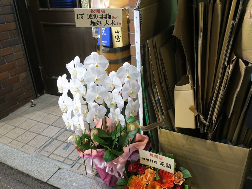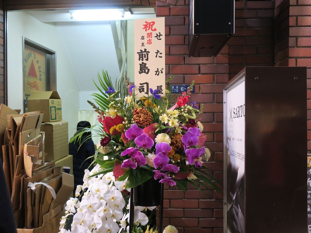 ビル1階地下へのエントランスには開店祝花。せたが屋、大木からの花がありました。結局約1時間後に店内へ。入店すると(通常は)まず券売機で食券購入です。