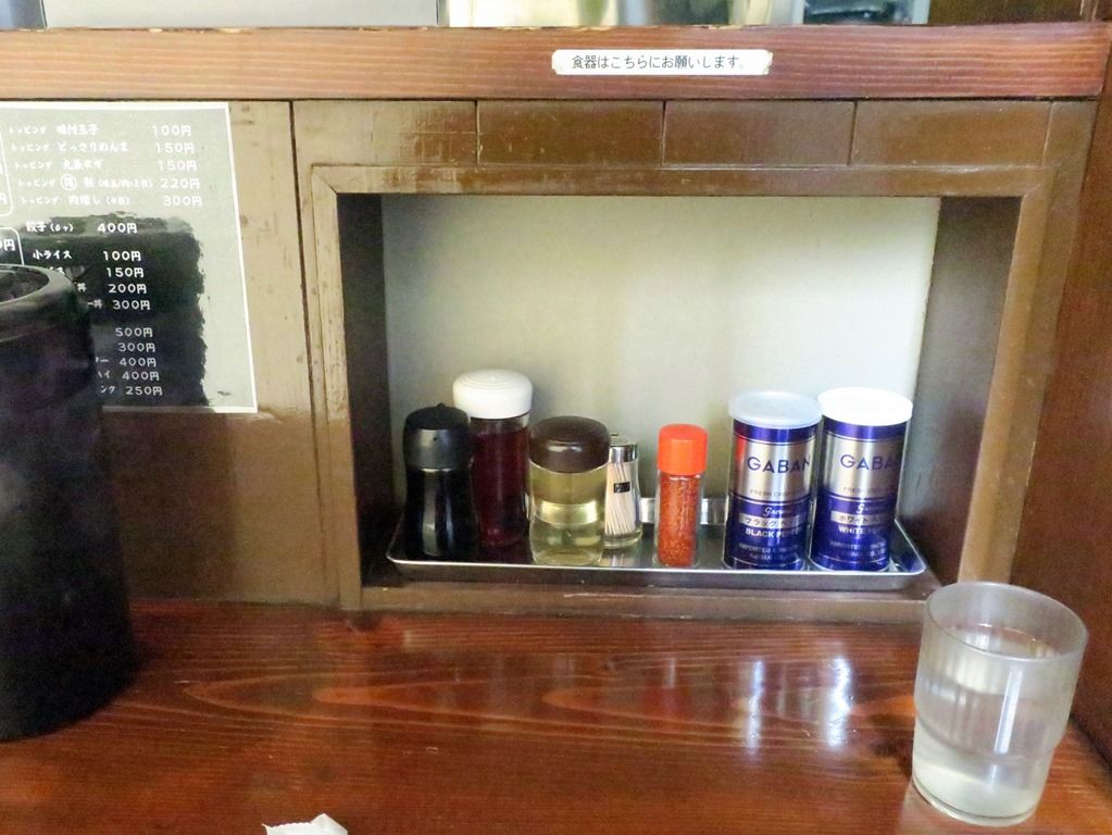 BGMは昭和歌謡、傷だらけのローラ、横須賀ストーリーとかw 箸は割り箸。卓上調味料は、醤油、ラー油、酢、一味唐辛子、GABANブラックペッパー・ホワイトペッパー。