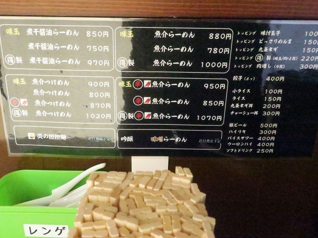 主なメニューは、煮干醤油らーめん750円、魚介らーめん780円、(辛)魚介らーめん850、魚介つけ麺800円、(辛)魚介つけ麺870円、他。(仮)オープン中はメニューを絞っての営業。オーダーは、ベーシックメニュー先頭の煮干らーめんで。