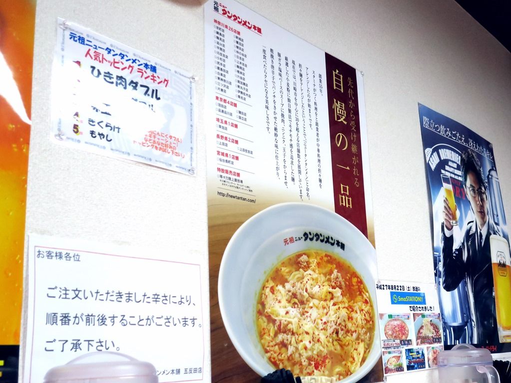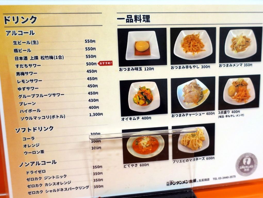 券売機は無く後会計制。主なメニューは、タンタンメン750円、まぜタン800円、タンメン830円、しょうゆラーメン650円、みそラーメン800円、他。