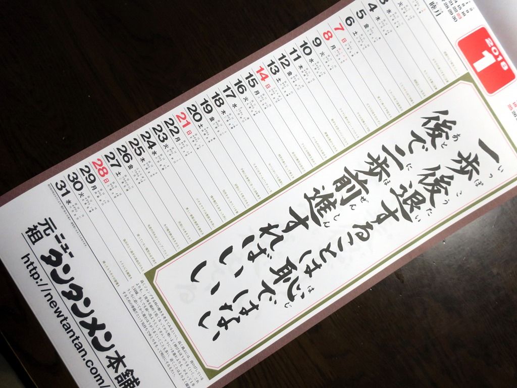 店内にご自由にお取り下さいと掲示のあるダンボール。中にはニュータンタンメン本譜カレンダーがあって、声をかけていただいちゃいました。毎月1個、日ごとにも人生訓・処世訓のある、日めくりでrはないですが毎日修造みたいなタイプ。