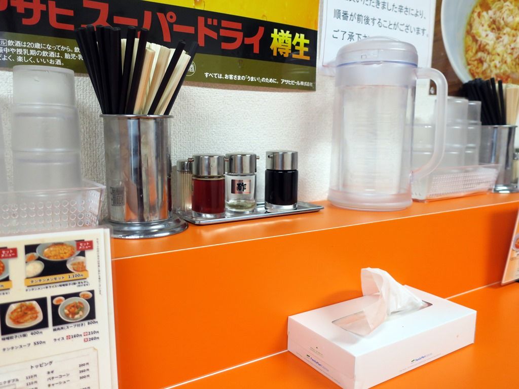 BGMはJ-Pop.箸は洗い箸と割り箸でW装備。卓上調味料は、醤油、酢、ラー油。