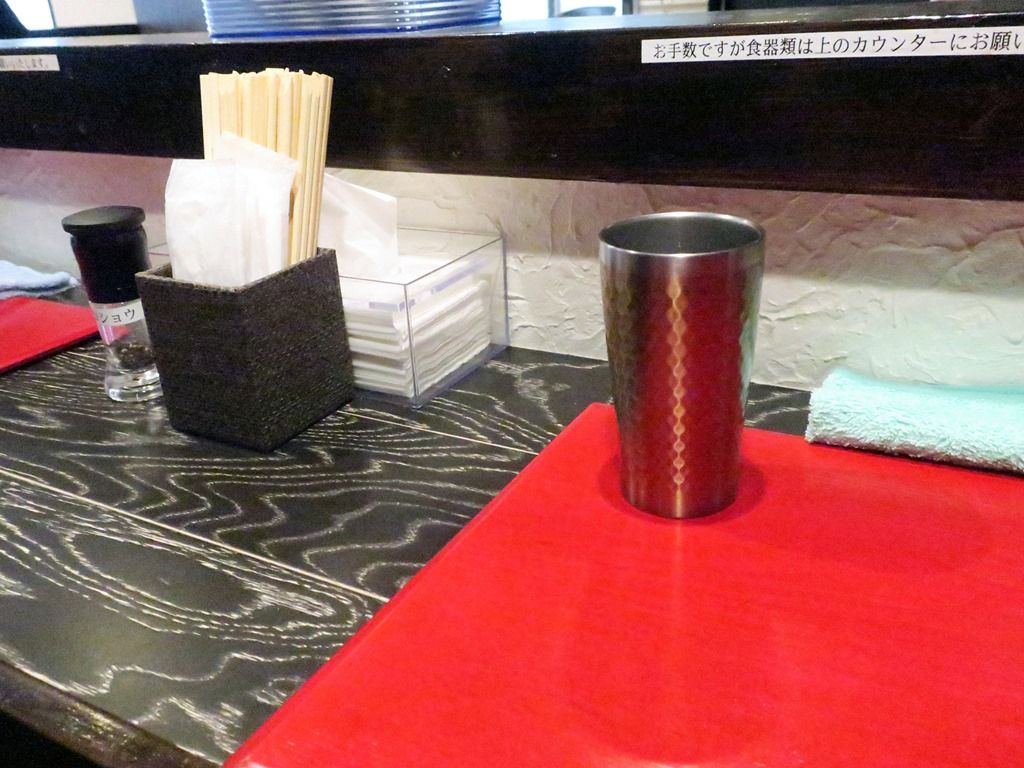 BGMはラップ。箸は割り箸。卓上調味料は、ミル入りミックスペッパー。